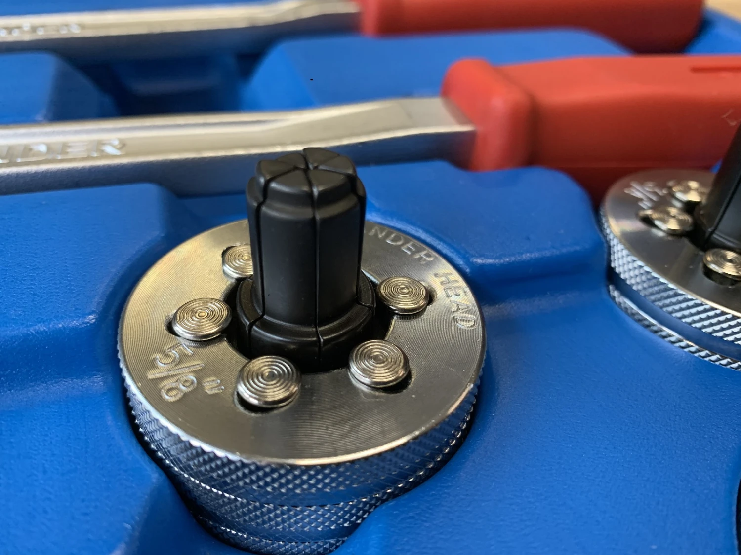7 têtes pour diamètres : 3/8 », 1/2 », 5/8 », 3/4 », 7/8 », 1 », 1-1/8 » pouces (inch).