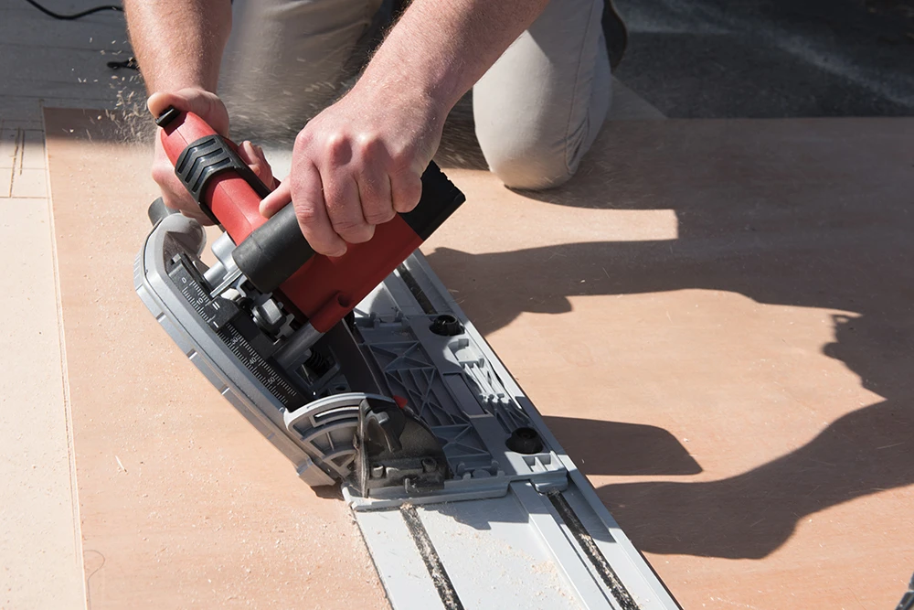 Scie circulaire plongeante constituée d’une base en fonte d’aluminium, d’un cache-lame et d’une tubulure d’extraction des poussières.
