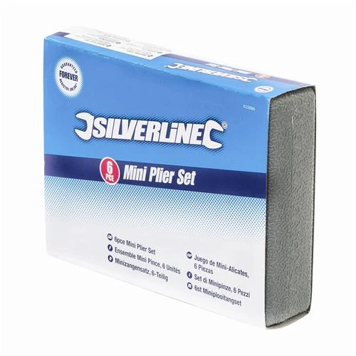 Jeu de 6 mini pinces à poignées bicolores en PVC à ressort. Comprend pince à bec long 125 mm, pince à bec étroit 125 mm, pince diagonale 110 mm, pince universelle 125 mm, pince à bec courbé 125 mm et tenailles coupantes 100 mm dans un coffret pratique.