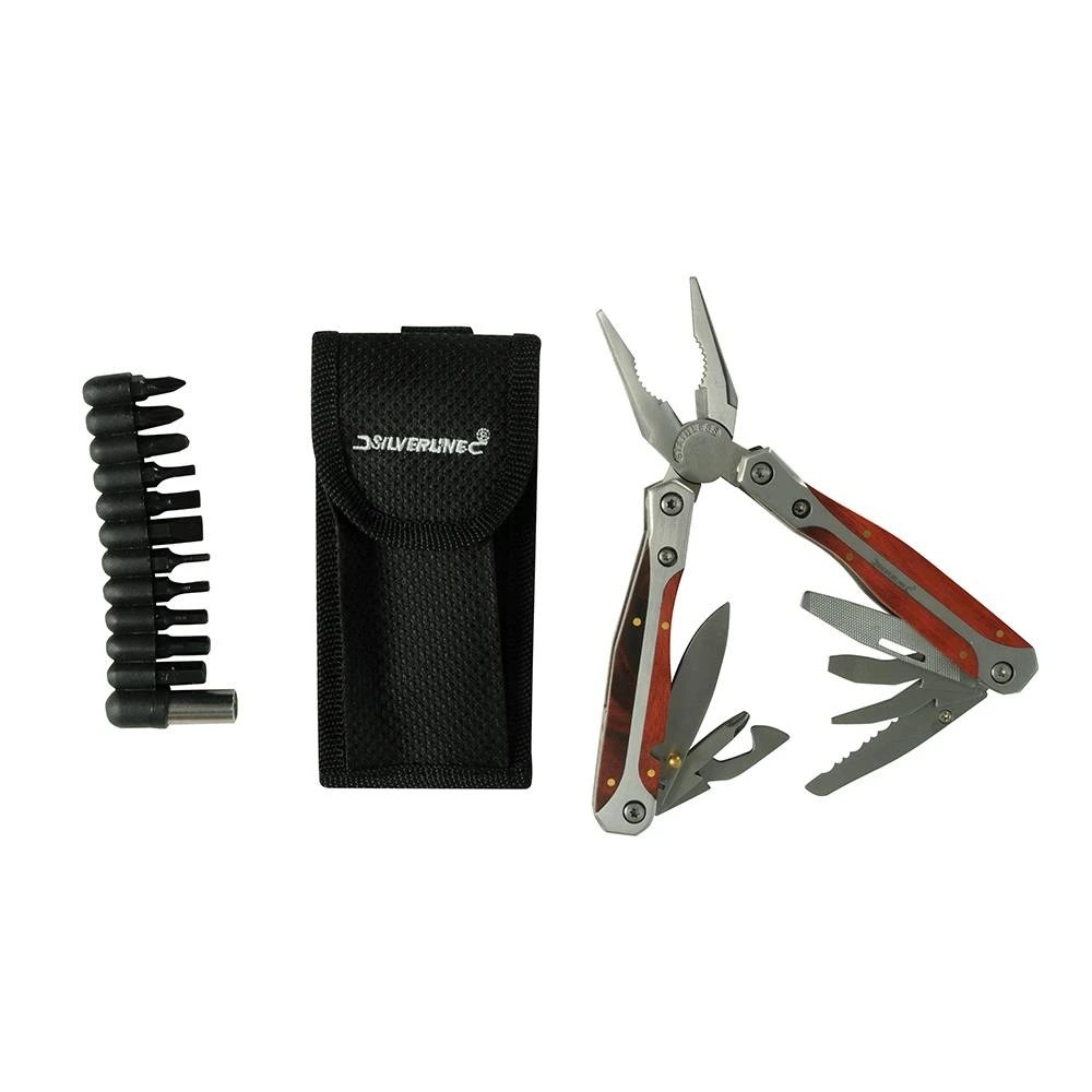 En acier inoxydable avec incrustations de bois. Comprend décapsuleur, ouvre-boîte, couteau, pince, scie, limes, tournevis plats et tournevis cruciformes, adaptateur et ensemble de 10 embouts de tournevis dans un étui en nylon.