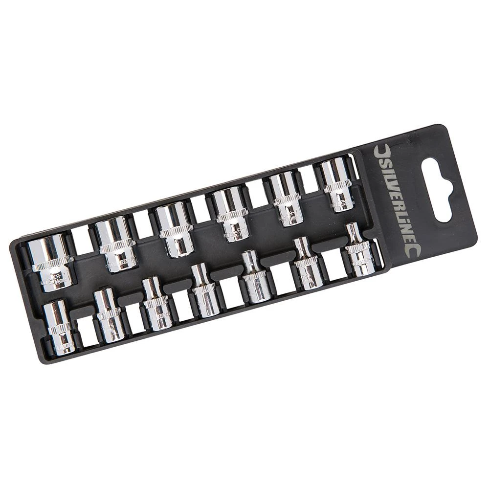 Douilles métriques 6 pans en acier chrome-vanadium, carré conducteur. Contenu : 4, 4,5, 5, 5,5, 6, 7, 8, 9, 10, 11, 12, 13 et 14 mm.