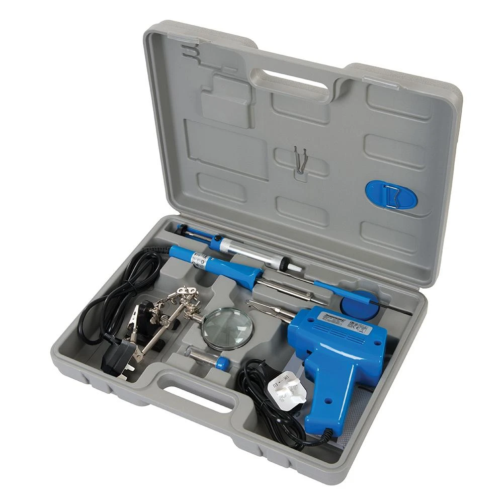 Comprend support de refroidissement et outil de positionnement, flux décapant, fil à souder, outil de dessoudage, support avec loupe et pointe de rechange pour pistolet à souder.