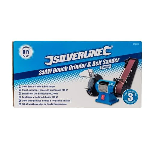 Outil 2-en-1 constitué d’un touret à meuler de 150 mm et d’une ponceuse à bande. Structure robuste en fonte d’aluminium et moteur à induction longue durée de vie avec roulements scellés. Interrupteur étanche à la poussière et pieds caoutchoutés. Idéal pour le meulage des métaux et le ponçage de divers matériaux tels que le métal, le bois et le plastique. Vitesse à vide : 2 950 tr/min (touret), 15 m/s (ponceuse à bande). Fourni avec : meule, bande de ponçage grain 80, 2 repose-outils en acier, pare-étincelles et écran protecteur.