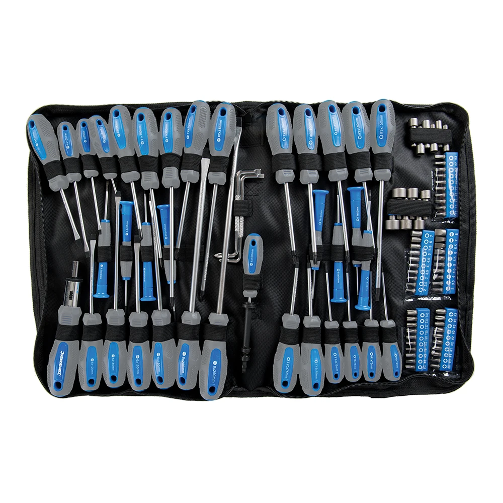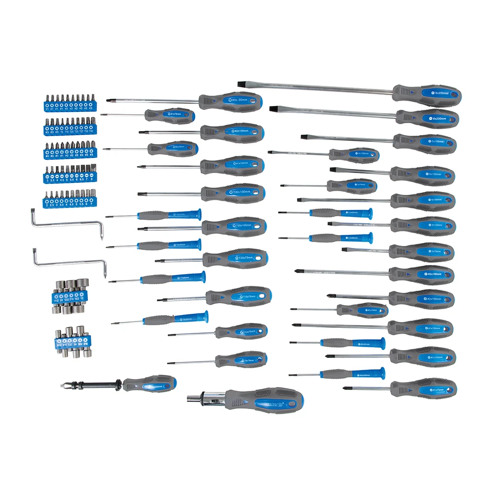 9 x tournevis plats (3 x 75, 4 x 100, 5 x 75, 5 x 100, 6 x 100, 5 x 150, 6 x 150, 8 x 200 et 8 x 250 mm).
